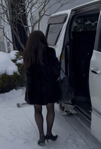 ブラックグラマー毛皮の中は ノーパン黒パンストで訪問中です❣️ 感じさせる前に、感じちゃいます^_^